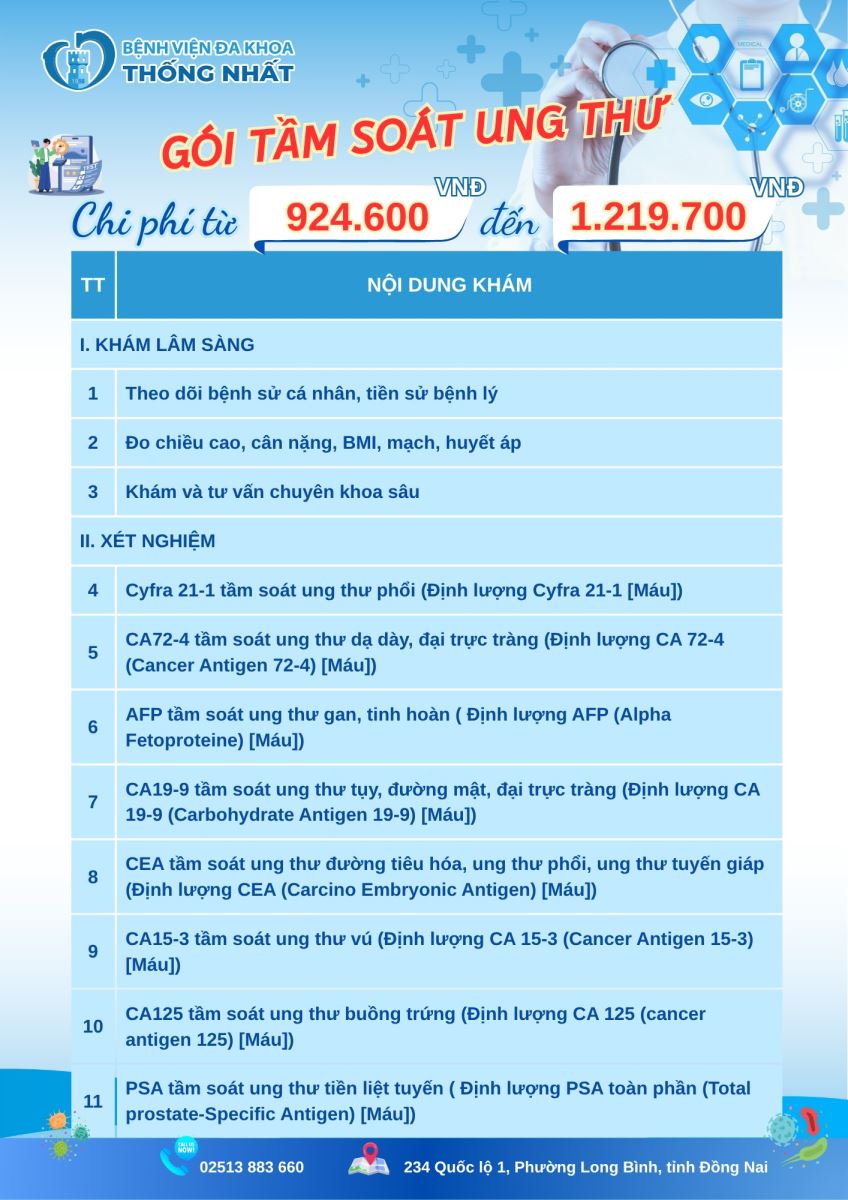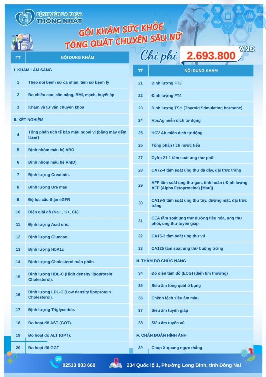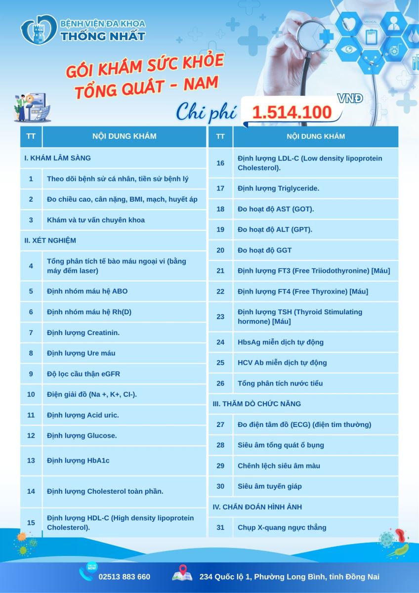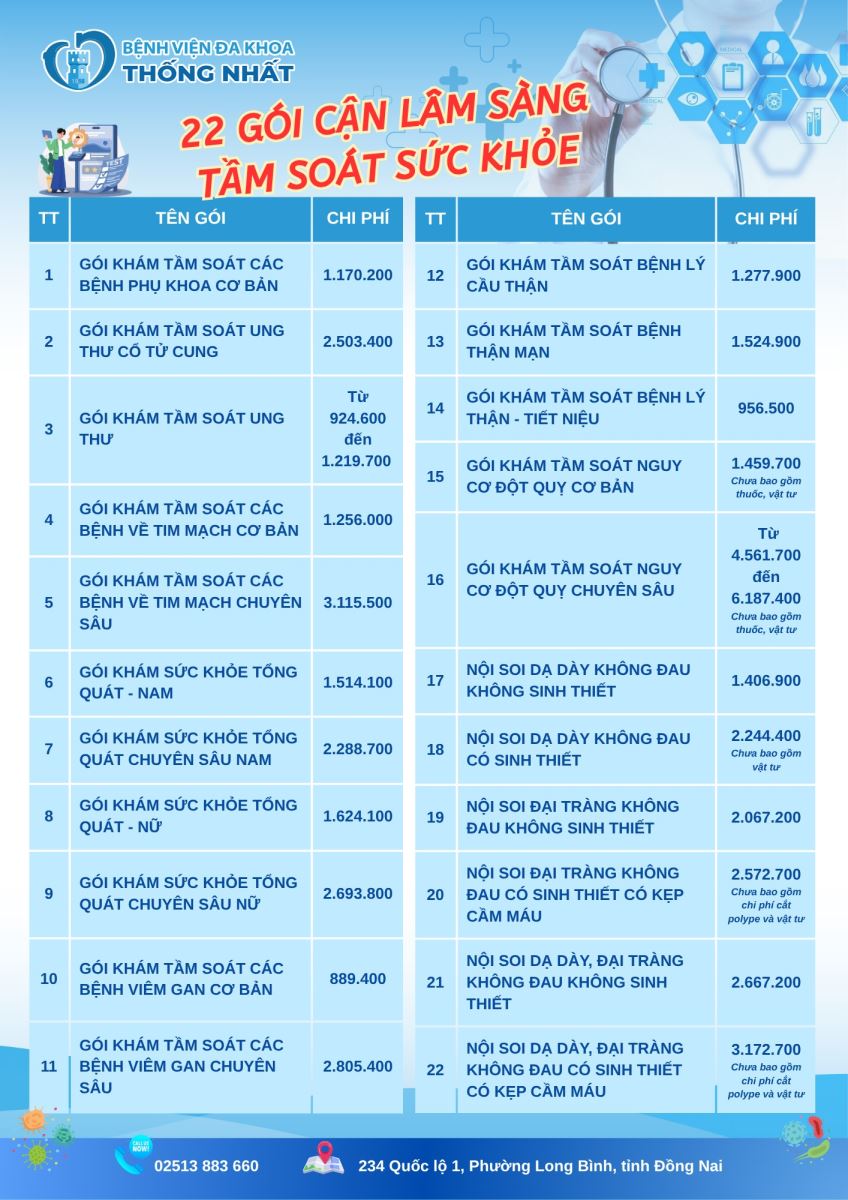Tại Bệnh viện Đa Khoa Thống Nhất Đồng Nai, chúng tôi triển khai 22 gói cận lâm sàng tầm soát dành cho từng nhóm đối tượng: