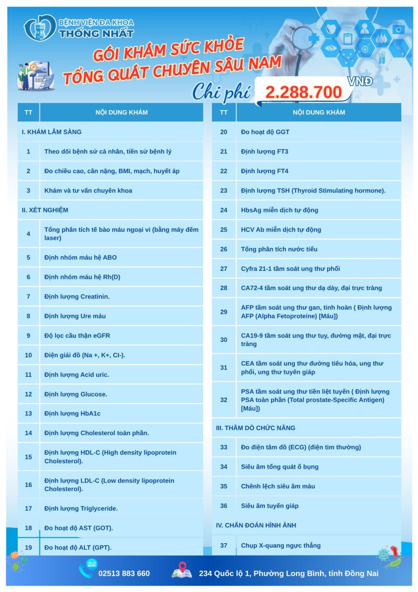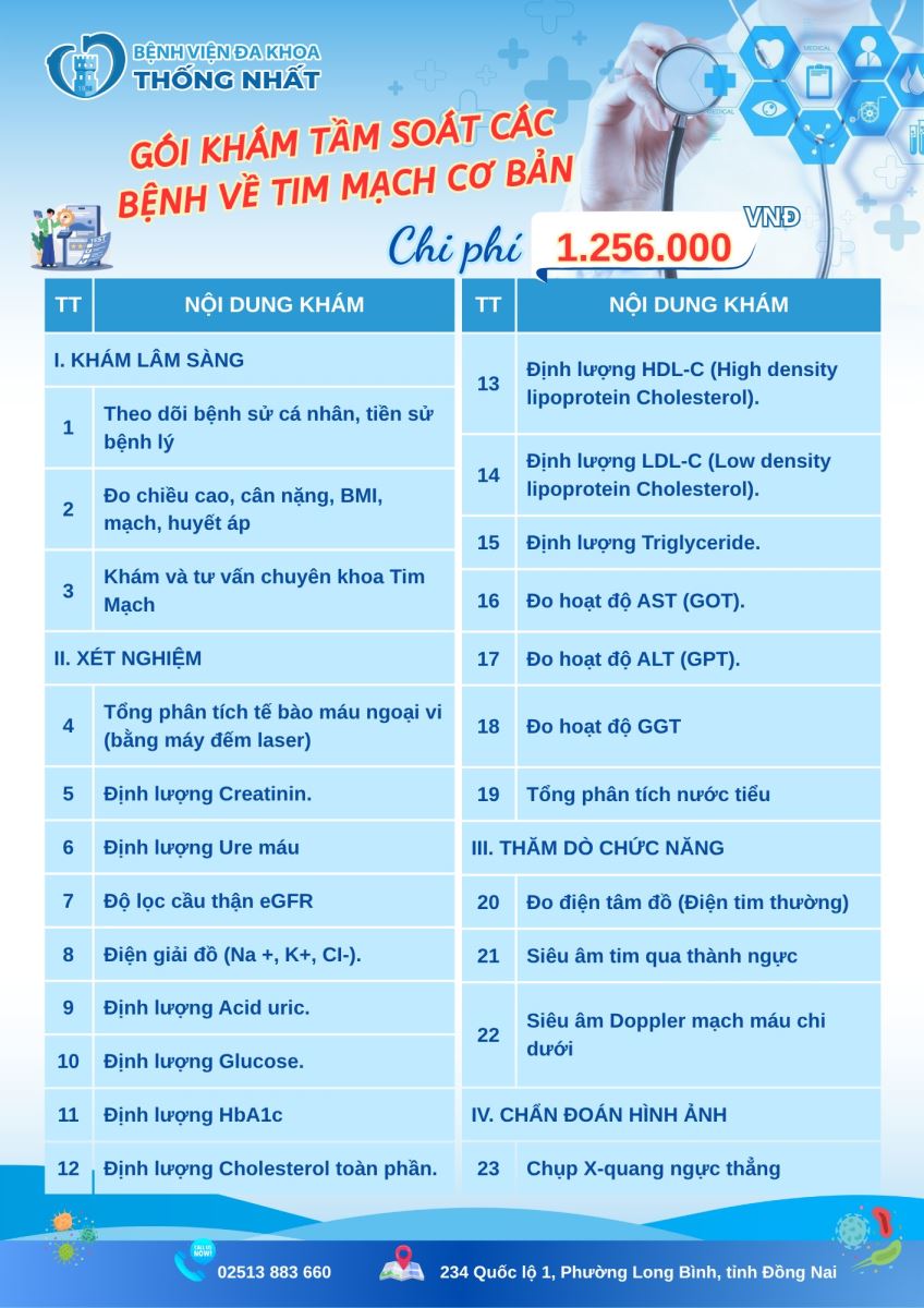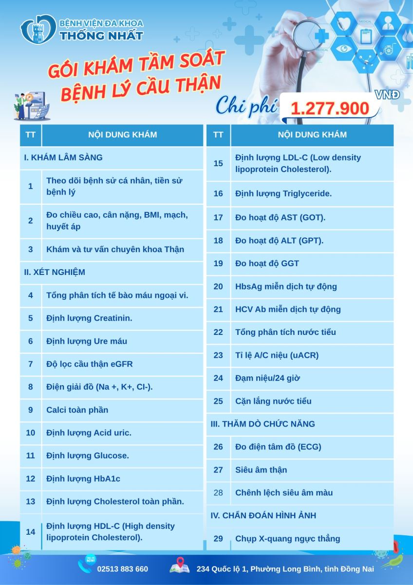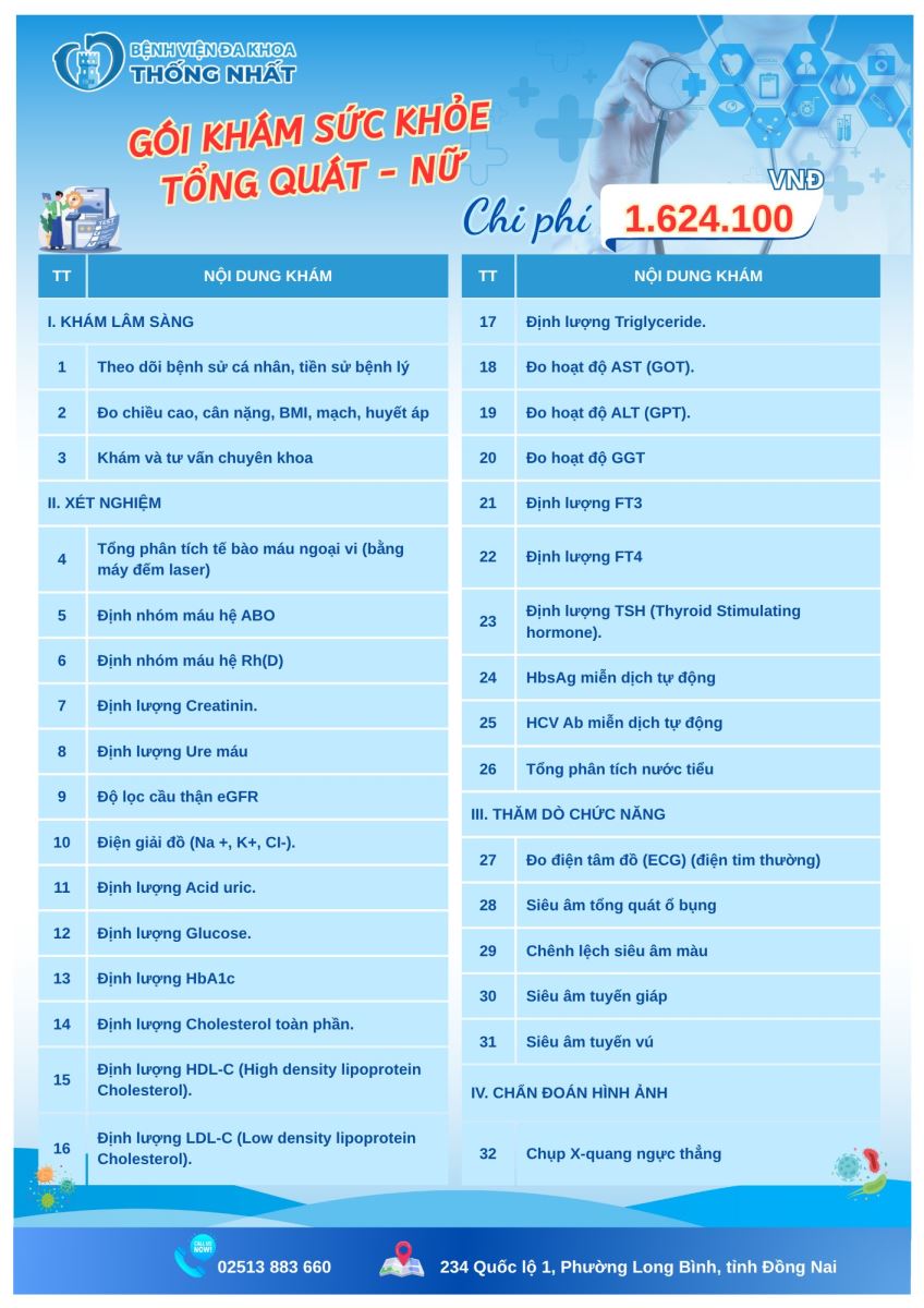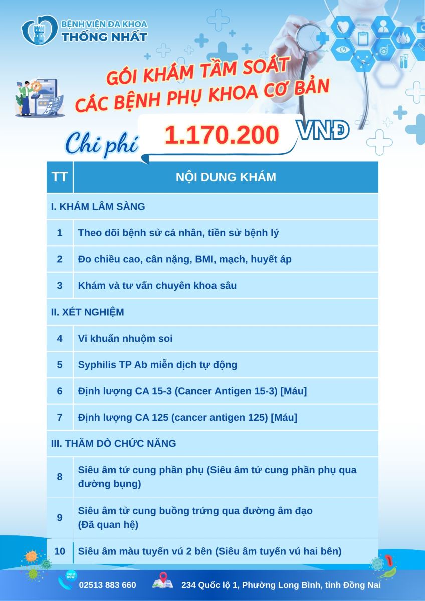 Tại Bệnh viện Đa Khoa Thống Nhất Đồng Nai, chúng tôi triển khai 22 gói cận lâm sàng tầm soát dành cho từng nhóm đối tượng: