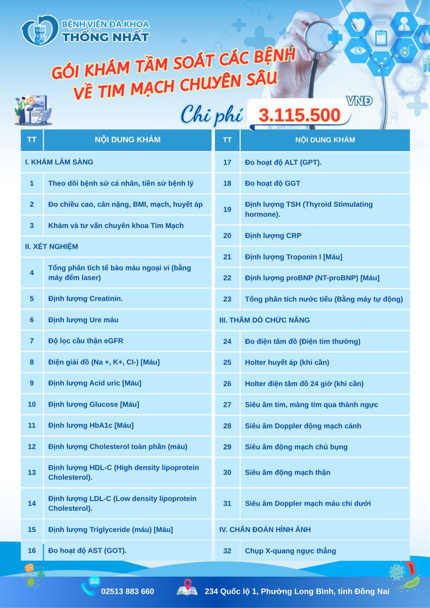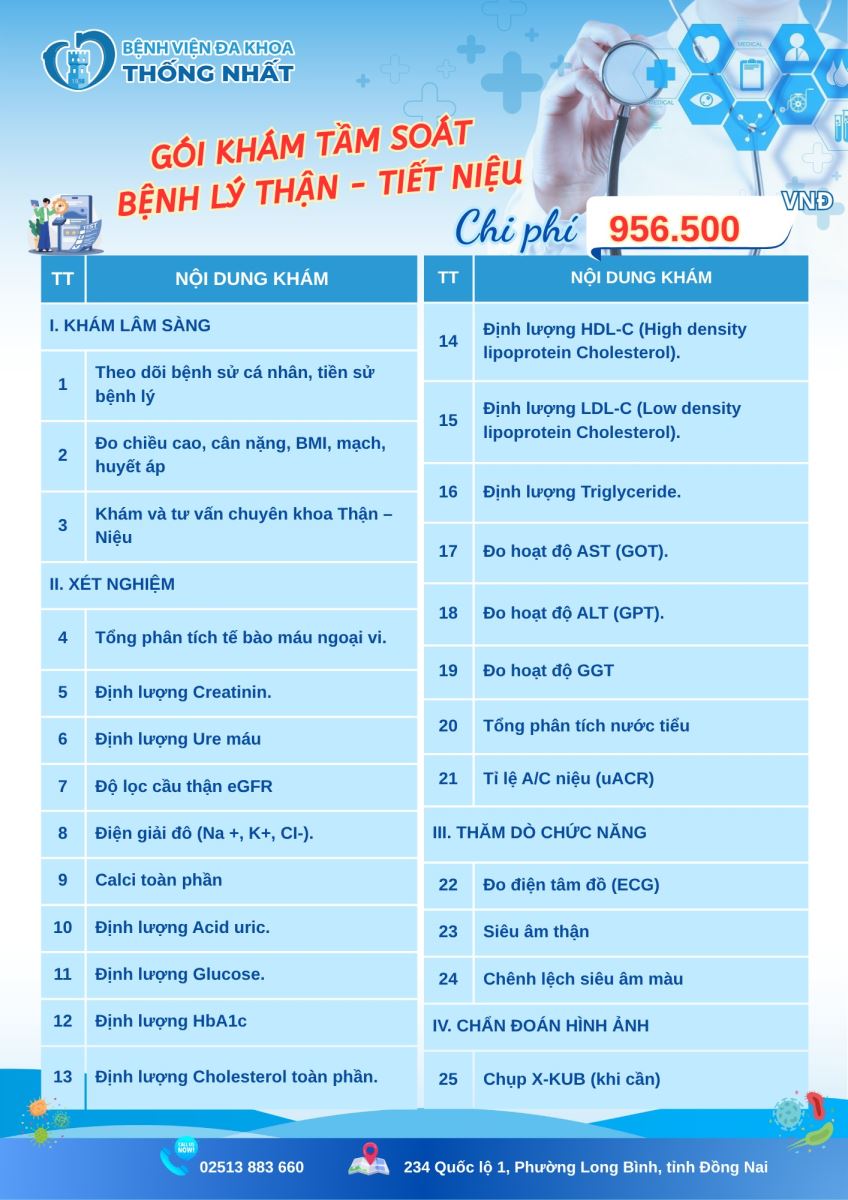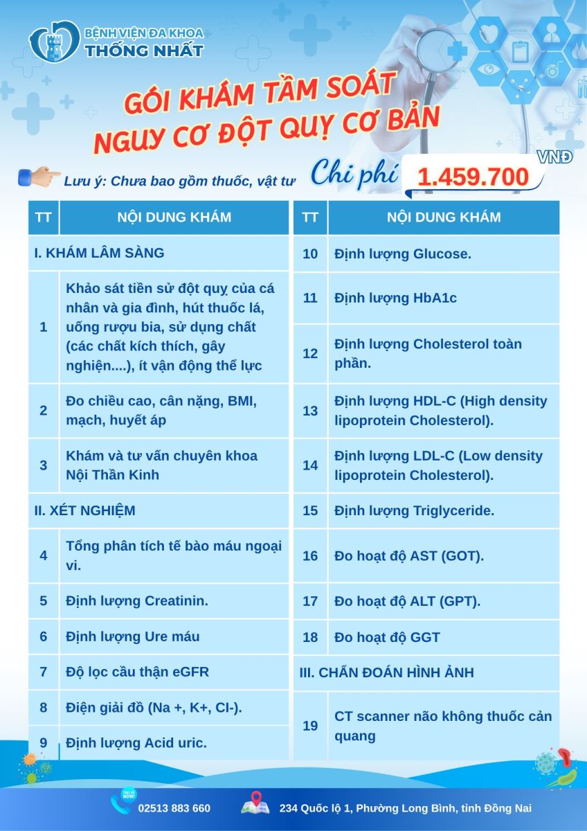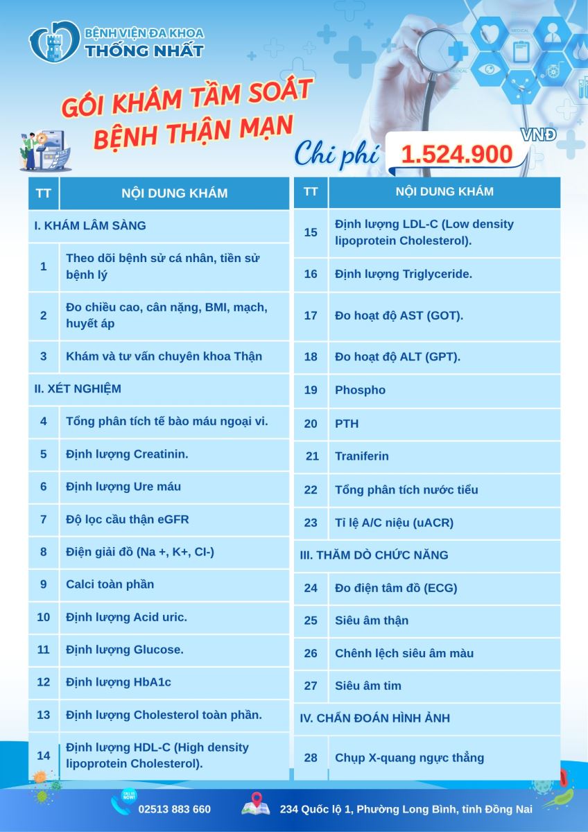Tại Bệnh viện Đa Khoa Thống Nhất Đồng Nai, chúng tôi triển khai 22 gói cận lâm sàng tầm soát dành cho từng nhóm đối tượng: