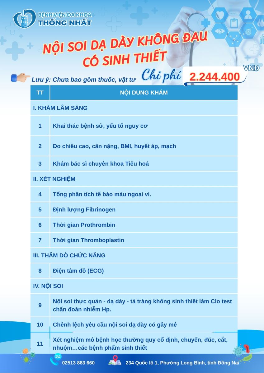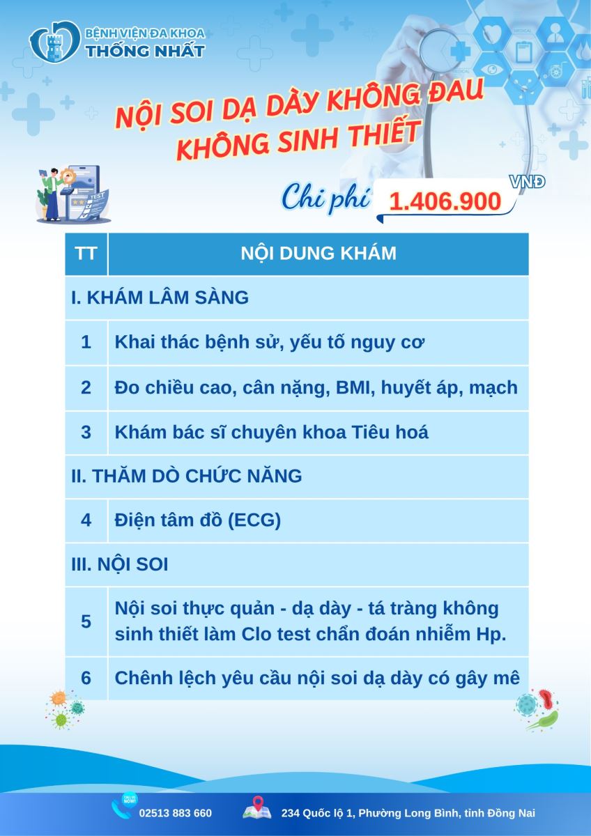 18. Nội soi dạ dày không đau có sinh thiết (Chưa bao gồm vật tư): Cho người mà trong quá trình nội soi hoặc tiền sử có tổn thương tiền ung thư, loét nghi ngờ ung thư, polype hoặc u trong thực quản, dạ dày, tá tràng.