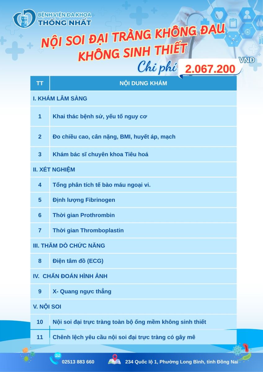 19. Nội soi đại tràng không đau không sinh thiết: Người trên 45 tuổi, có rối loạn tiêu hóa táo bón, tiêu chảy kéo dài, đi cầu có phân máu, tiền sử bản thân hoặc gia đình có polype hoặc ung thư đại tràng.