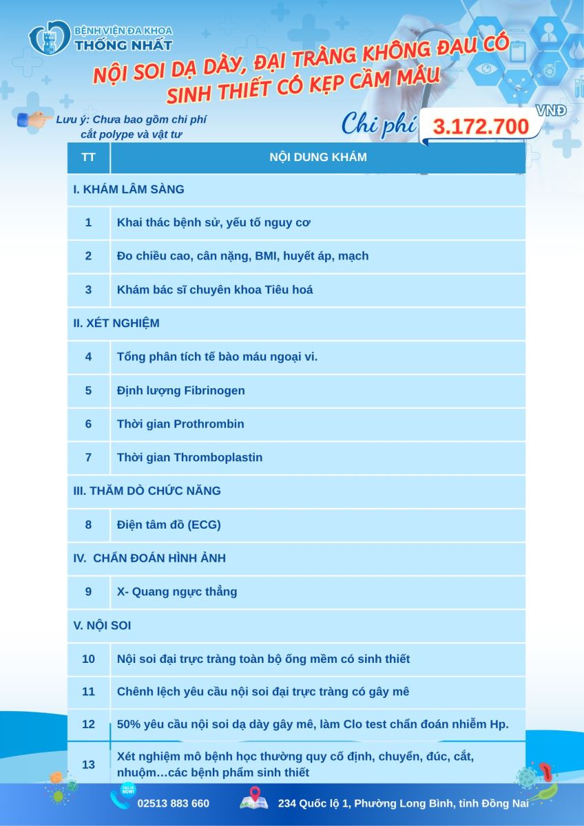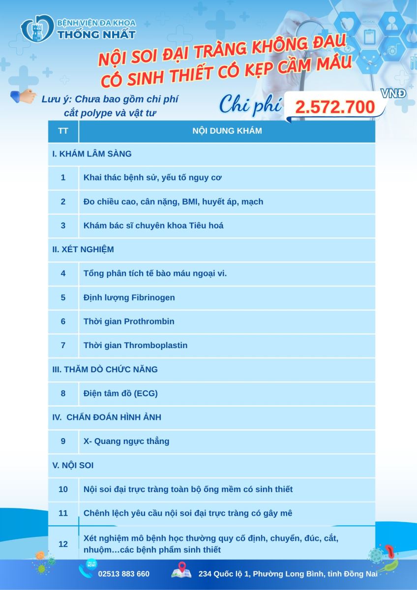 20. Nội soi đại tràng không đau có sinh thiết có kẹp cầm máu (Chưa bao gồm chi phí cắt polype và vật tư): Khi người bệnh có tổn thương polype, viêm loét, chảy máu trên nội soi hoặc được làm các thủ thuật có chảy máu.