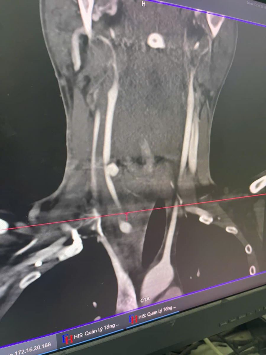 Khám cấp cứu ghi nhận : có dấu hiệu sốc mất máu; Vết thương: 2cm bên cổ phải, nghi ngờ đứt động mạch cảnh chung phải. Ngay khi tiếp nhận bệnh nhân, các bác sĩ tại khoa Cấp cứu lập tức kích hoạt báo động đỏ nội viện, huy động toàn bộ ekip đề điều trị bệnh nhân sớm nhất. Cuộc phẫu thuật giành giật sự sống