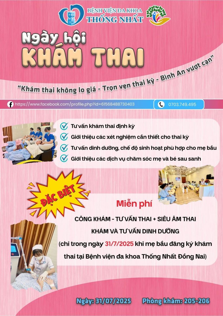 Các mẹ bầu ơi, đừng bỏ lỡ! Ngày 31/07/2025 (Thứ 5), Khoa Sản – Bệnh viện Đa khoa Thống Nhất Đồng Nai sẽ tổ chức Ngày hội khám thai quy mô nhất từ trước đến nay với nhiều ưu đãi đặc biệt và hoạt động ý nghĩa! Chương trình nhằm nâng cao ý thức khám thai định kỳ, tầm soát bệnh lý thai kỳ, tư vấn dinh dưỡng, giới thiệu các dịch vụ sinh – chăm sóc mẹ và bé chất lượng, tiết kiệm chi phí. ƯU ĐÃI ĐẶC BIỆT DUY NHẤT NGÀY 31/7: Miễn phí công khám – tư vấn Miễn phí siêu âm thai Miễn phí khám & tư vấn dinh dưỡng Giao lưu trực tiếp cùng chuyên gia đầu ngành: ThS.BS Đào Thị Anh Vinh – Phó Trưởng Khoa Sản ThS.BS Đoàn Quyết Thắng – Phó Khoa Dinh Dưỡng Thời gian: 8h – 10h sáng, ngày 31/07/2025 (thứ năm) Tại Khoa Sản – Bệnh viện Đa khoa Thống Nhất Đồng Nai Nhanh tay đăng ký, số lượng có hạn! Hotline: 0703749495 (giờ hành chính) Địa chỉ: 234 Quốc lộ 1A, P.Long Bình, Đồng Nai