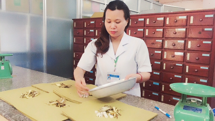 Nhân viên kho thuốc đông y cấp phát vị thuốc YHCT cho người bệnh ngoại trú