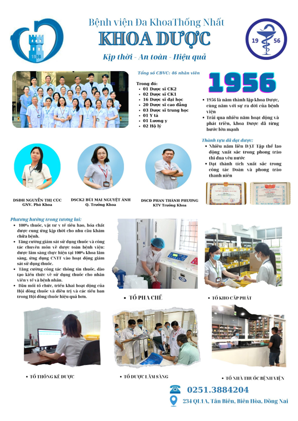 - Khoa Dược được thành lập cùng với sự ra đời của Bệnh viện Đa khoa Thống Nhất tỉnh Đồng Nai. Qua nhiều năm hoạt động và phát triển, Khoa Dược đã hoàn thành tốt vai trò bảo đảm cung ứng thuốc, hoá chất và vật tư tiêu hao đạt chất lượng, phục vụ kịp thời cho công tác điều trị. Đồng thời đảm bảo công tác quản lý xuất nhập thuốc, hóa chất vật tư tiêu hao theo đúng quy định hiện hành.