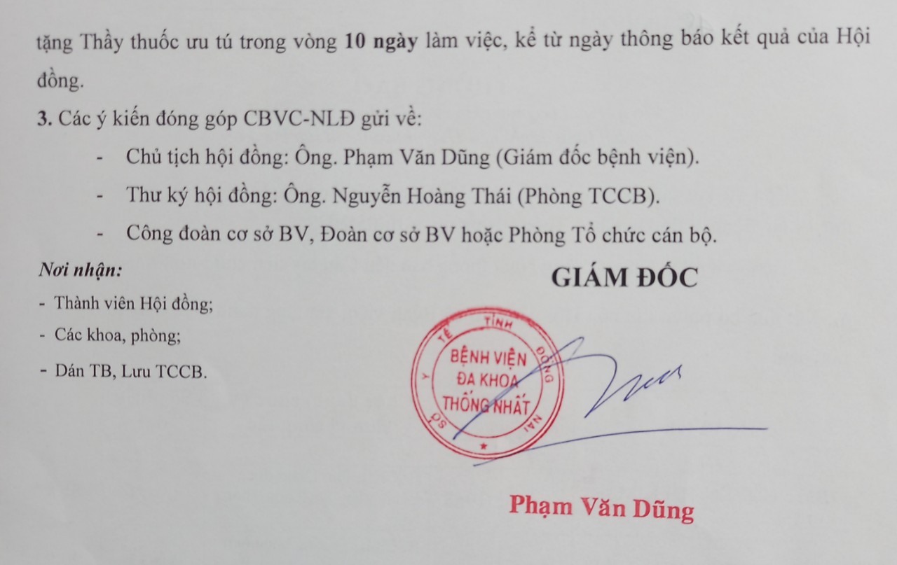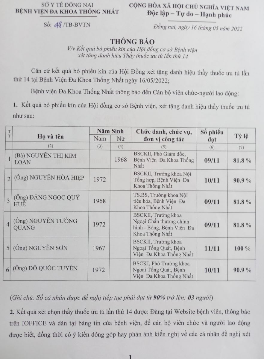 “Bệnh viện đa khoa Thống Nhất - Đồng Nai là Cấp khám bệnh, chữa bệnh CHUYÊN SÂU, SỐ ĐIỂM: 80”
