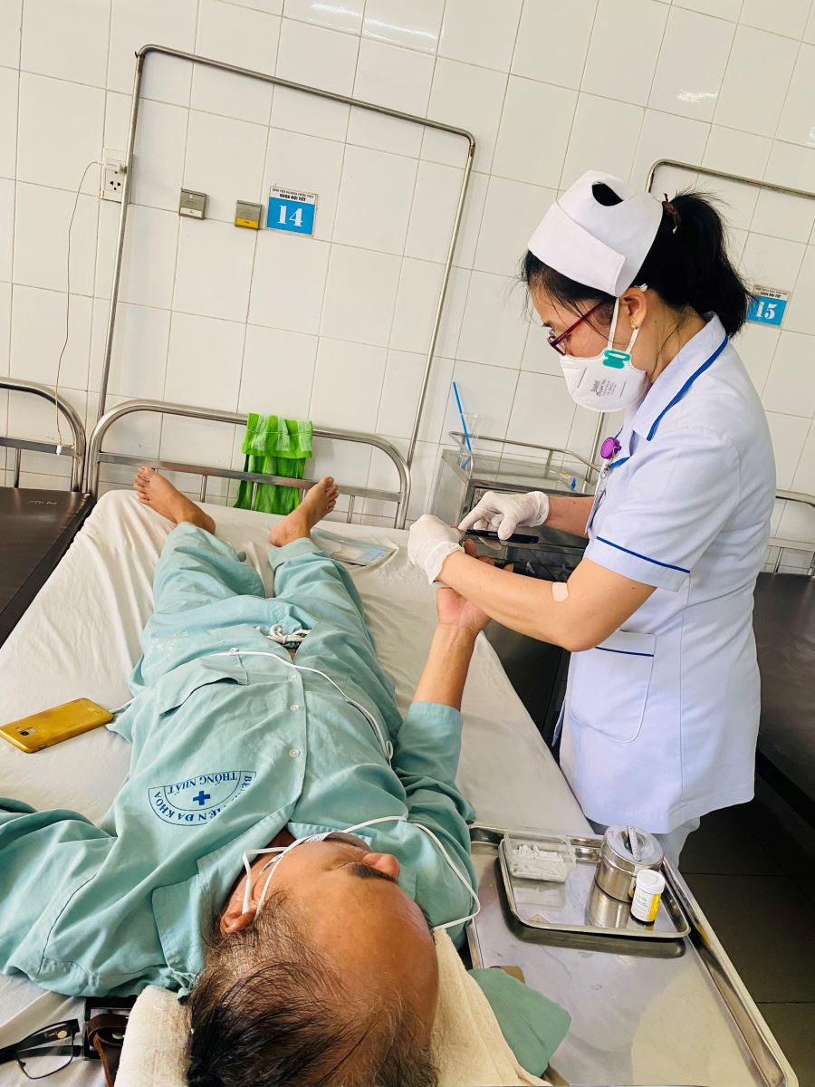 5.2 Điều dưỡng đang thử đường huyết tại giường và thay băng vết thương bàn chân đái tháo đường cho bệnh nhân nội trú.