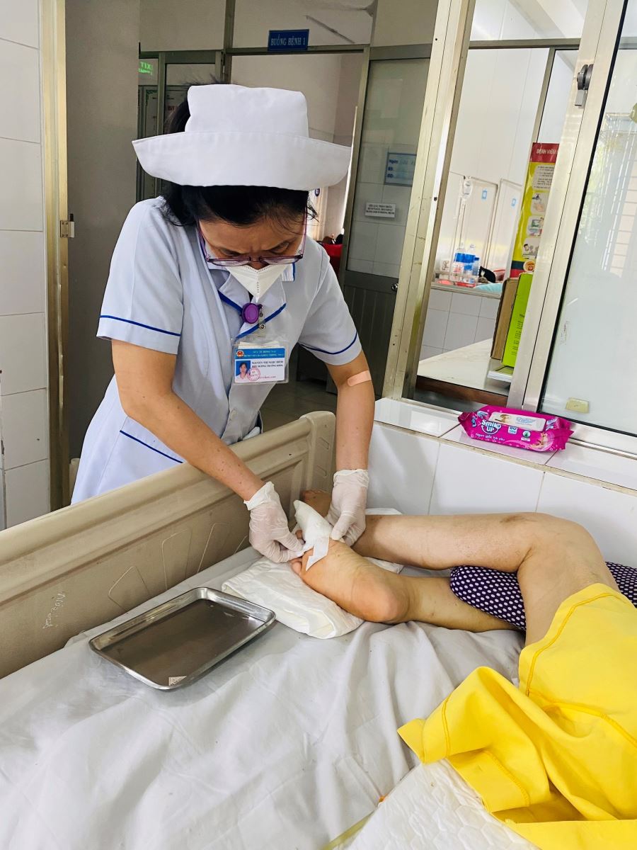 Điều dưỡng đang thử đường huyết tại giường và thay băng vết thương bàn chân đái tháo đường cho bệnh nhân nội trú. |