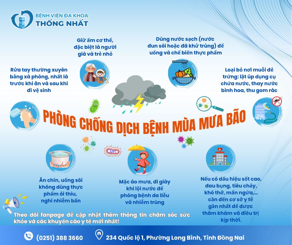 Mùa mưa bão không chỉ gây ra thiệt hại về tài sản mà còn tiềm ẩn nguy cơ bùng phát nhiều loại bệnh nguy hiểm như: Cảm cúm, viêm hô hấp do thời tiết ẩm ướt Sốt xuất huyết, Zika do muỗi truyền bệnh sinh sản trong nước đọng Tiêu chảy, bệnh đường ruột do thực phẩm nhiễm bẩn Viêm da, nấm da do tiếp xúc nước bẩn Các bệnh về mắt, bệnh viêm kết mạc Thương hàn, leptospira (nhiễm khuẩn từ nước bẩn chứa phân, nước tiểu động vật) Để bảo vệ sức khỏe cho bản thân và gia đình, bạn cần: Rửa tay thường xuyên bằng xà phòng, nhất là trước khi ăn và sau khi đi vệ sinh Dùng nước sạch (nước đun sôi hoặc đã khử trùng) để uống và chế biến thực phẩm Ăn chín, uống sôi – không dùng thực phẩm ôi thiu, nghi nhiễm bẩn Mặc áo mưa, đi giày khi lội nước để phòng bệnh da liễu và nhiễm trùng Loại bỏ nơi muỗi đẻ trứng: lật úp dụng cụ chứa nước, thay nước bình hoa, thu gom rác Giữ ấm cơ thể, đặc biệt là người già và trẻ nhỏ Nếu có dấu hiệu sốt cao, đau bụng, tiêu chảy, khó thở, mẩn ngứa,… cần đến cơ sở y tế gần nhất để được thăm khám và điều trị kịp thời. Bệnh viện Đa khoa Thống Nhất Đồng Nai khuyến cáo cộng đồng chủ động phòng bệnh trong mùa mưa bão, chung tay bảo vệ sức khỏe – đẩy lùi dịch bệnh! Theo dõi fanpage để cập nhật thêm thông tin chăm sóc sức khỏe và các khuyến cáo y tế mới nhất!