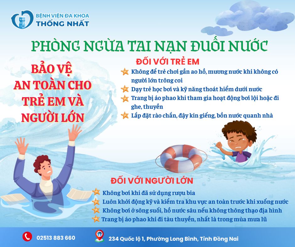 Đuối nước là một trong những tai nạn gây tử vong cao tại Việt Nam, không chỉ ở trẻ em mà còn ở người lớn, đặc biệt vào mùa hè, mùa mưa và trong các chuyến đi sông nước, du lịch biển. Theo thống kê, mỗi năm Việt Nam có hàng trăm ca tử vong do đuối nước – phần lớn là do thiếu kiến thức phòng tránh, thiếu kỹ năng xử lý tình huống, và chủ quan khi tiếp xúc môi trường nước. Bệnh viện Đa khoa Thống Nhất Đồng Nai khuyến cáo người dân cần chủ động thực hiện các biện pháp phòng tránh đuối nước cho cả trẻ em và người lớn như sau: ĐỐI VỚI TRẺ EM Không để trẻ chơi gần ao hồ, mương nước khi không có người lớn trông coi Dạy trẻ học bơi và kỹ năng thoát hiểm dưới nước Trang bị áo phao khi tham gia hoạt động bơi lội hoặc đi ghe, thuyền Lắp đặt rào chắn, đậy kín giếng, bồn nước quanh nhà ĐỐI VỚI NGƯỜI LỚN Không bơi khi đã sử dụng rượu bia Luôn khởi động kỹ và kiểm tra khu vực an toàn trước khi xuống nước Không bơi ở sông suối, hồ nước sâu nếu không thông thạo địa hình Trang bị áo phao khi đi tàu thuyền, nhất là trong mùa mưa lũ Tai nạn đuối nước xảy ra rất nhanh và thường không có dấu hiệu báo trước. Chỉ cần một phút bất cẩn – hậu quả có thể kéo dài suốt đời. Hãy chủ động phòng ngừa – nhận diện nguy cơ – hành động đúng cách.