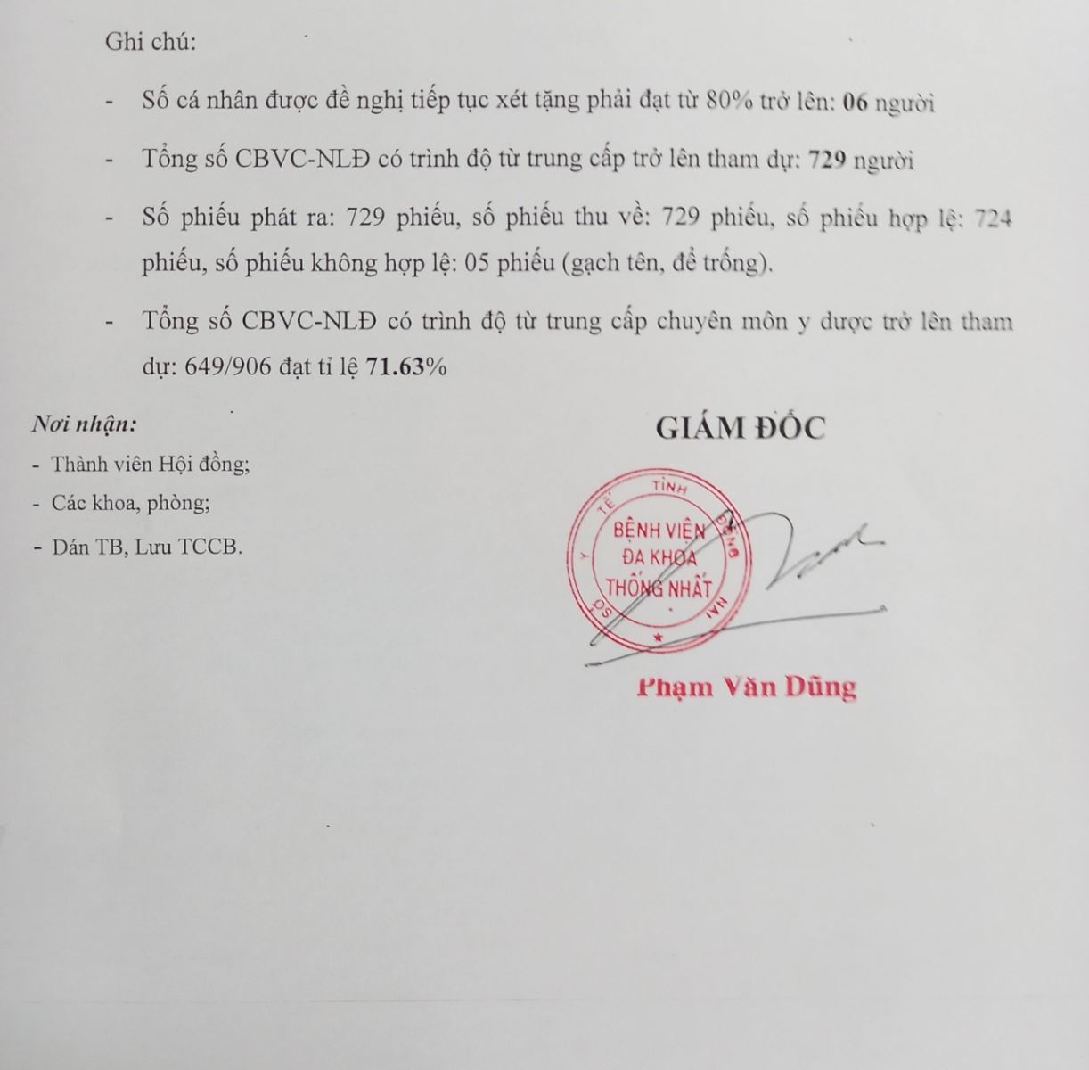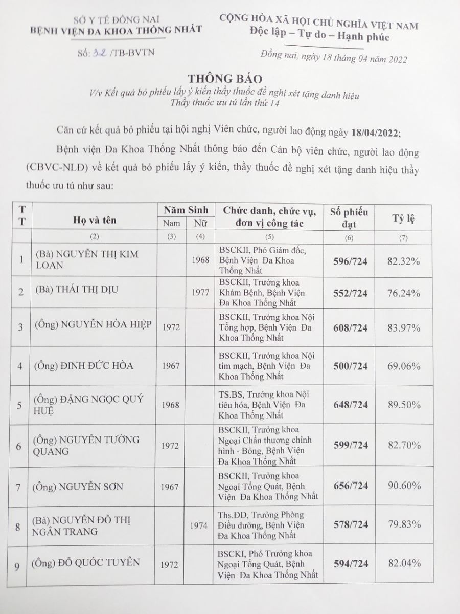 Thông báo kết quả bỏ phiếu thầy thuốc ưu tú (tại hội nghị viên chức người lao động ngày 18/4/2022)