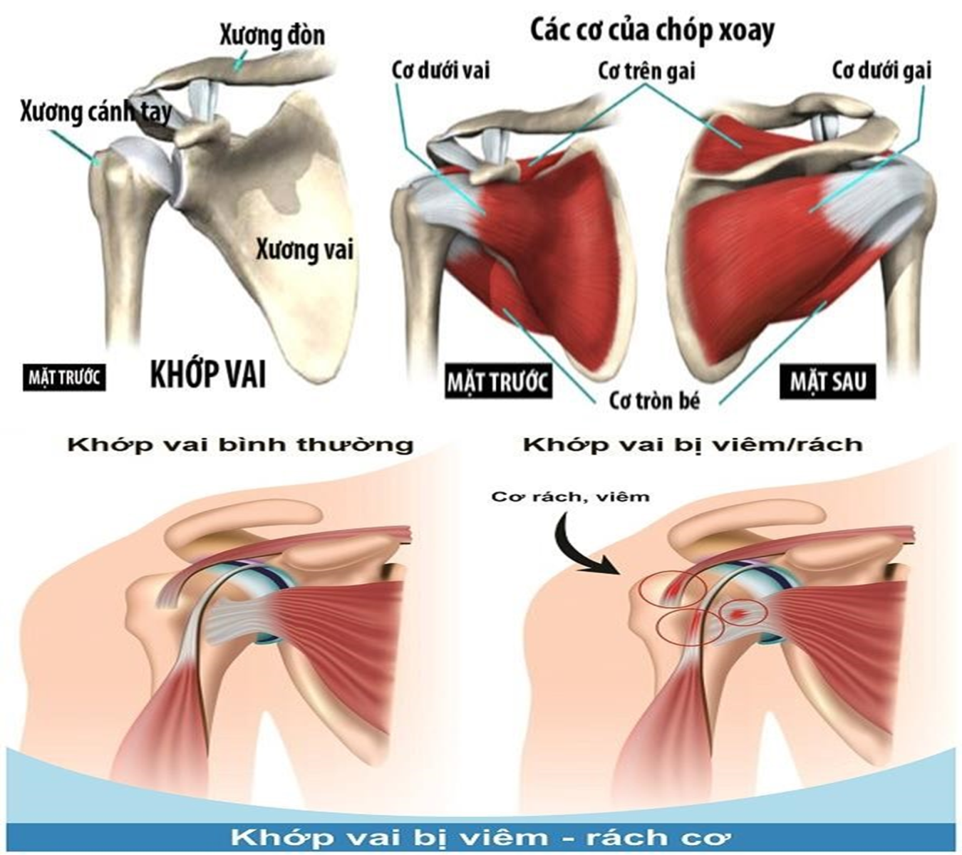 Chóp xoay gồm 4 cơ của khớp vai, theo thứ tự trước ra sau là cơ dưới vai, cơ trên gai, cơ dưới gai và cơ tròn bé. Nhóm các cơ ngày có tác dụng giữ vững khớp vai một phần và có nhiệm vụ cử động vai. Khớp vai cũng là khớp được sử dụng nhiều trong suốt đời người và đây cũng chính là điểm làm cho chóp xoay dễ bị viêm hay đứt.